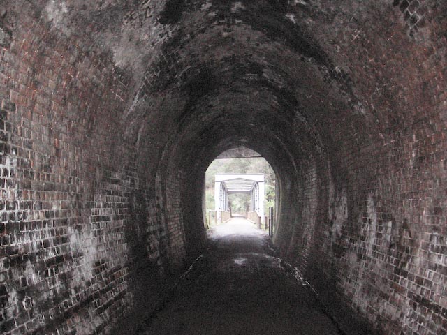 after a late start I ride back into t having a short stop at the doc office to pay the camp frees?(around $9 a night) leaving t around 11 am I ride back towards paeroa riding on the same road as I came to Thames on stoping at a cafe for lunch getting into paeroa around 2pm I go into the info center to find out about walks in the karangahake gorge (the info center as odd hours as it closes around 3 pm ) riding into the karangahake gorge I head to the old crown battery site where part of the old rail line has been tuned into a walkway/cycle way with a 1 km tunnel that has lights in it (thought still take a light with you as the lights are not very good in the tunnel) at the start of the track as I am getting the trailer through a tight part I see a note that say's that the tunnel Will be close for upgrading of the suffice? and the lights at the end of the month check out the doc web site for more info) as I'm riding on top of the road bridge (the train used to go on top of the road bridge ) I see some people coming from the tunnel on bike's so I ask then to back up a bit as the walkway is to narrow to pass . at the start of the tunnel I put my lights on so I can see where i'm going( also so that other people can see me) as I ride through the tunnel I have a good look at the walls and how the tunnel was made and see a few place where water is flowing down the wall (the tunnel was built in 1904) out of the tunnel and back across the river( on the paeroa side of the tunnel the road is below the tunnel — on the waihi end the road run's over the top of the tunnel (see photos) it's slow going along the old rail bed as my wheels sink in to the lose gravel (riding around 12-18 km/h) at the Owharoa waterfall's I head up a side road to dickey flat as there is a doc camp site there (on part of the way there is a gravel road to ride on to get there) where I spend the night